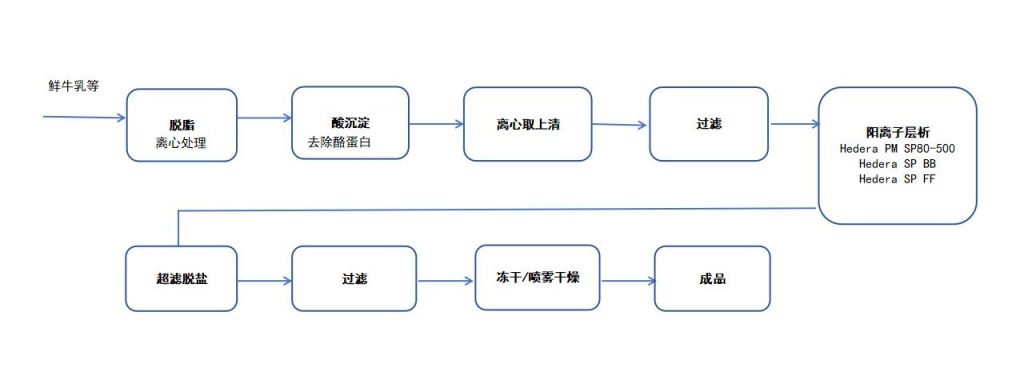 根據層析原理不同,層析介質可分為親和層析填料、離子交換填料、凝膠過濾層析填料、疏水填料等,層析填料的基質有葡聚糖、瓊脂糖、聚合物等不同基質。在乳鐵蛋白的純化中主要應用陽離子交換填料,用于吸附乳鐵蛋白。經驗證Hedera SP BB/Hedera SP FF兩款填料對于乳鐵蛋白的分離均有良好的分離效果,Lf純度>95%。