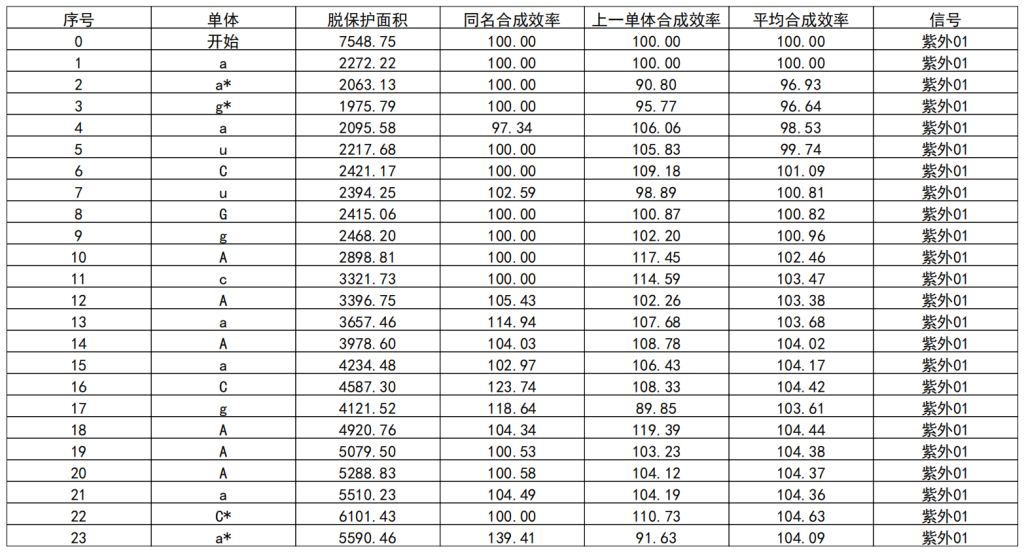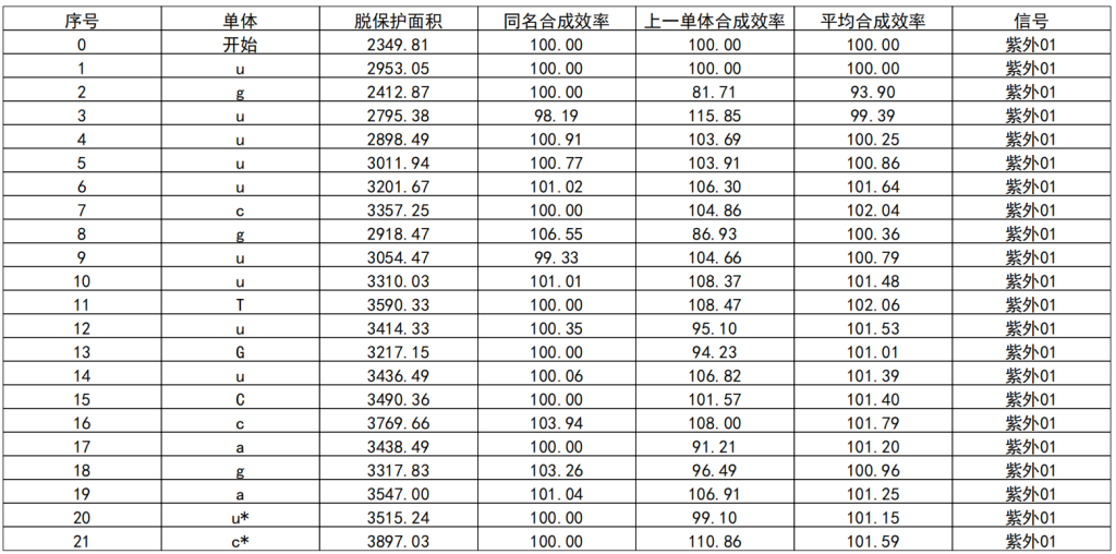 合成系統利用UV紫外檢測器實時監測脫保護階段DMT基團的吸收值,在經過脫保護清洗階段后,通過UV不再起峰或有峰值來判定是否清洗干凈。經過多次實驗觀察對比,優化后的方法能夠精準控制脫保護的時間和用量,避免因脫保護時間過長或酸濃度過高而產生的脫嘌呤雜質。