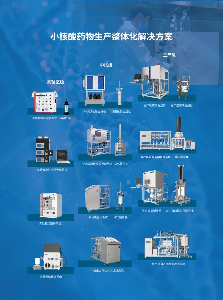 銀河集團科技為客戶提供涵蓋核酸合成系統、層析系統、制備液相系統及切向流過濾系統在內的完整產品組合,全面支持從基礎研究、工藝開發到規模化生產的各個環節。公司產品線可滿足從實驗室級別探索、中試工藝放大到工業級生產的全方位需求,憑借穩定可靠的系統性能和靈活可擴展的配置方案,為小核酸藥物從早期研發到商業化生產全流程提供堅實的技術支撐與解決方案。
